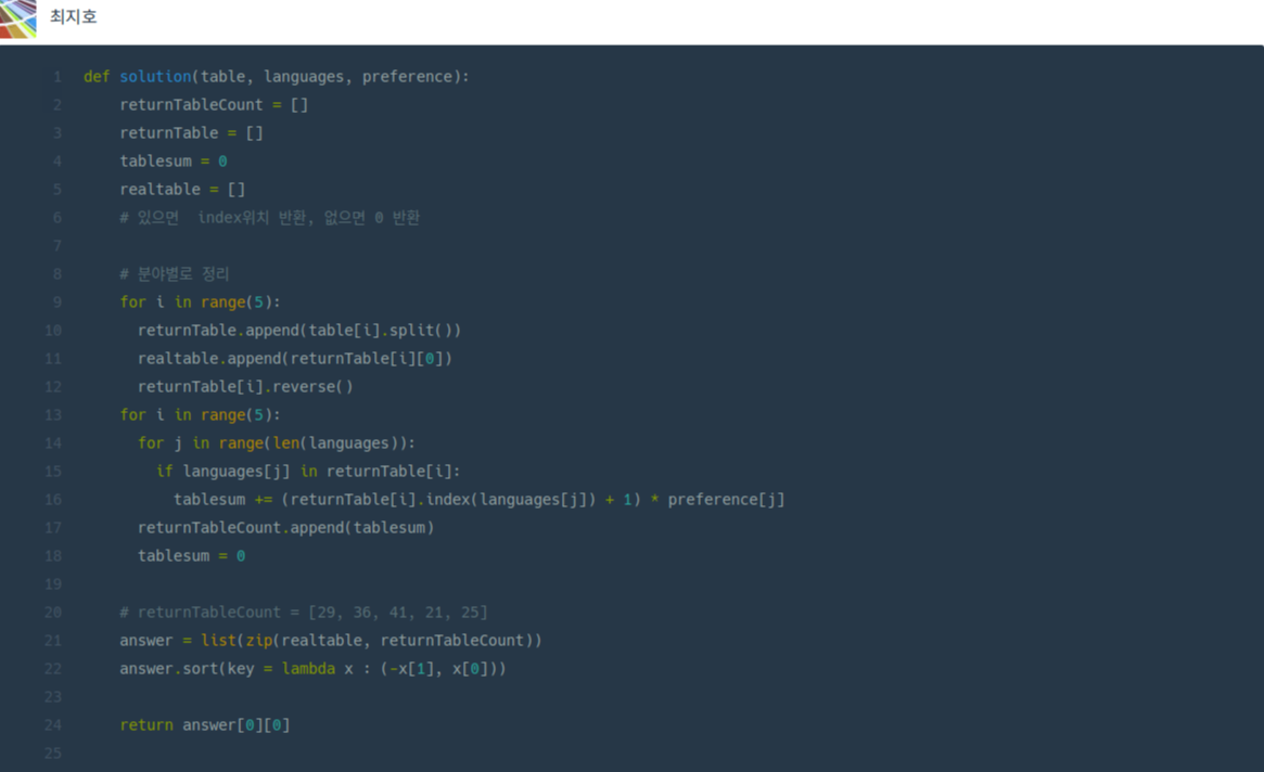 def solution(table, languages, preference): returnTableCount = [] returnTable = [] tablesum = 0 realtable = [] # 있으면 index위치 반환, 없으면 0 반환 # 분야별로 정리 for i in range(5): returnTable.append(table[i].split()) realtable.append(returnTable[i][0]) returnTable[i].reverse() for i in range(5): for j in range(len(languages)): if languages[j] in returnTable[i]: tablesum += (returnTable[i].index(languages[j]) + 1) * preference[j] returnTableCount.append(tablesum) tablesum = 0 # returnTableCount = [29, 36, 41, 21, 25] answer = list(zip(realtable, returnTableCount)) answer.sort(key = lambda x : (-x[1], x[0])) return answer[0][0] |