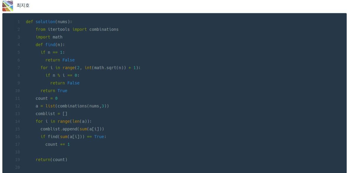 def solution(nums): from itertools import combinations import math def find(n): if n == 1: return False for i in range(2, int(math.sqrt(n)) + 1): if n % i == 0: return False return True count = 0 a = list(combinations(nums,3)) comblist = [] for i in range(len(a)): comblist.append(sum(a[i])) if find(sum(a[i])) == True: count += 1 return(count) |