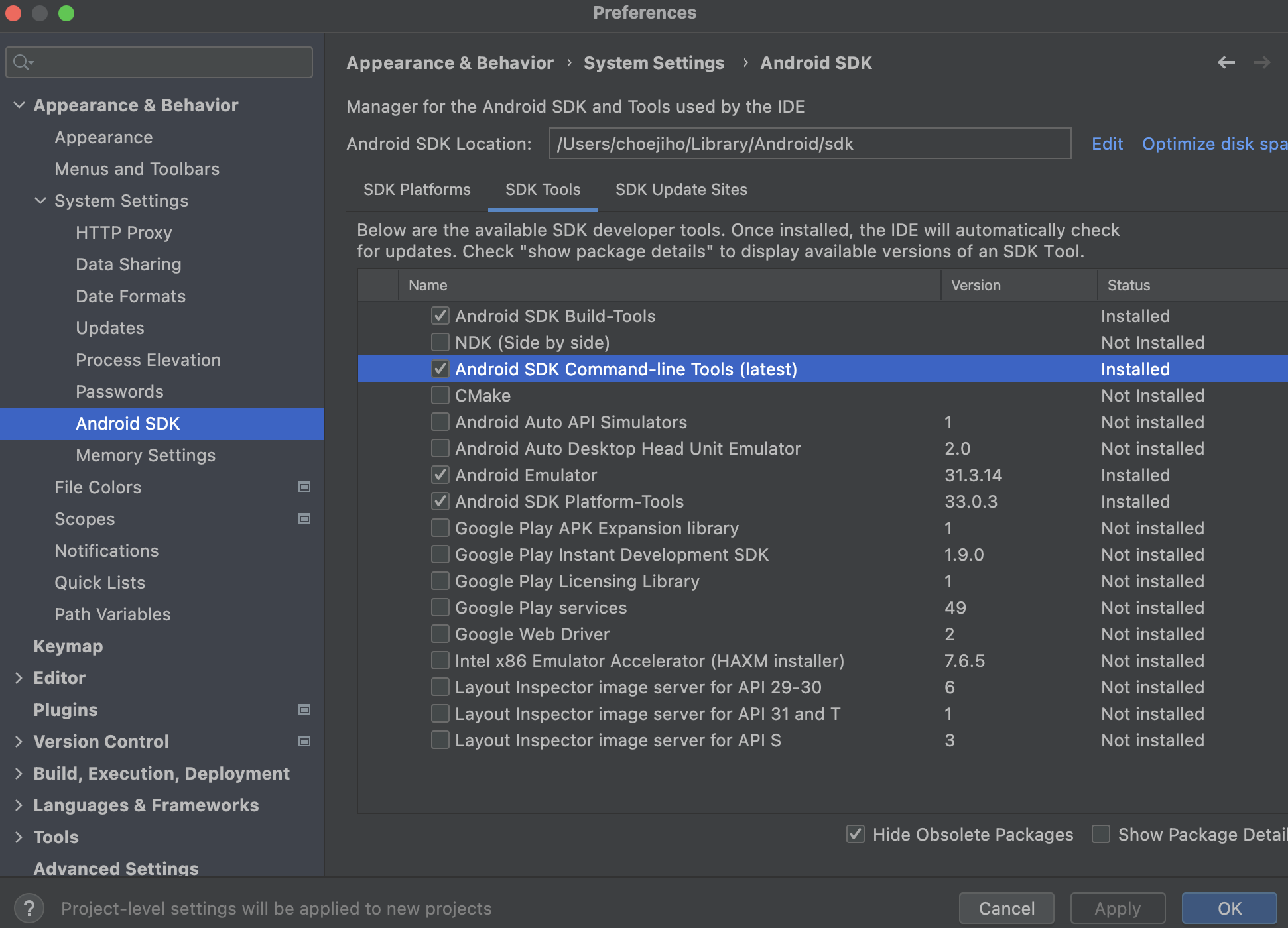 그리고 왼쪽 메뉴에서 System Settings - Android SDK - SDK Tools에서 Android SDK Command-line Tools (latest)를 Check 한 후 Apply 하면 된다.