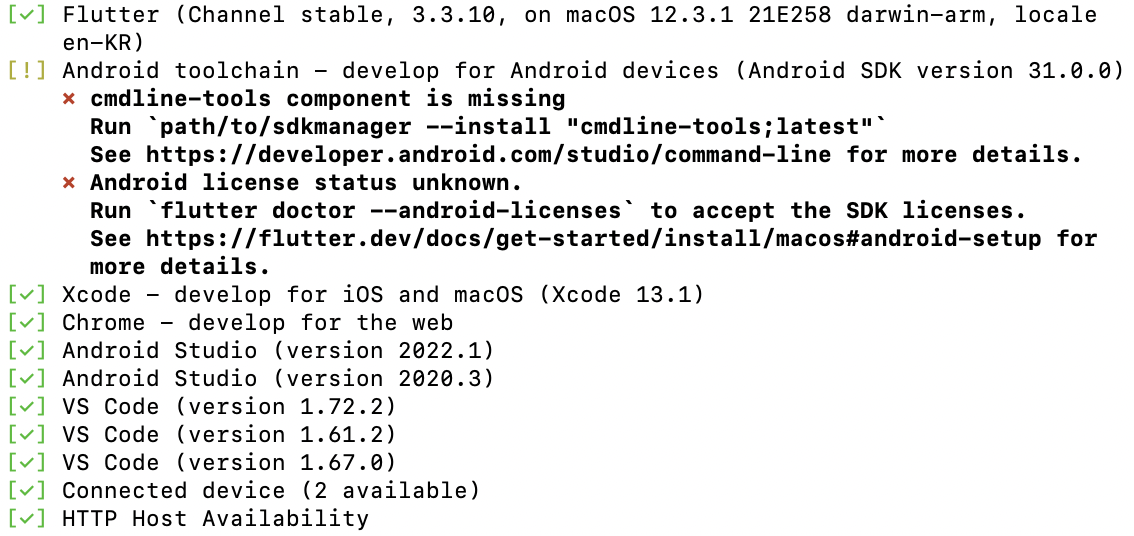 이제 다 설치했다면 terminal을 열어 flutter doctor를 입력해 보자! 설치된 것은 초록색 check표시가 잘 되어있고, 설치가 안된 것이 있다면 빨간색으로 x표시가 되어있을 것이다.