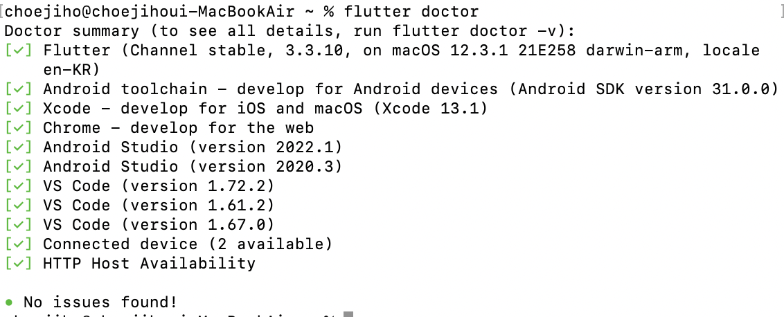 - 그리고 flutter doctor로 확인해 보면 문제가 사라져 있다!