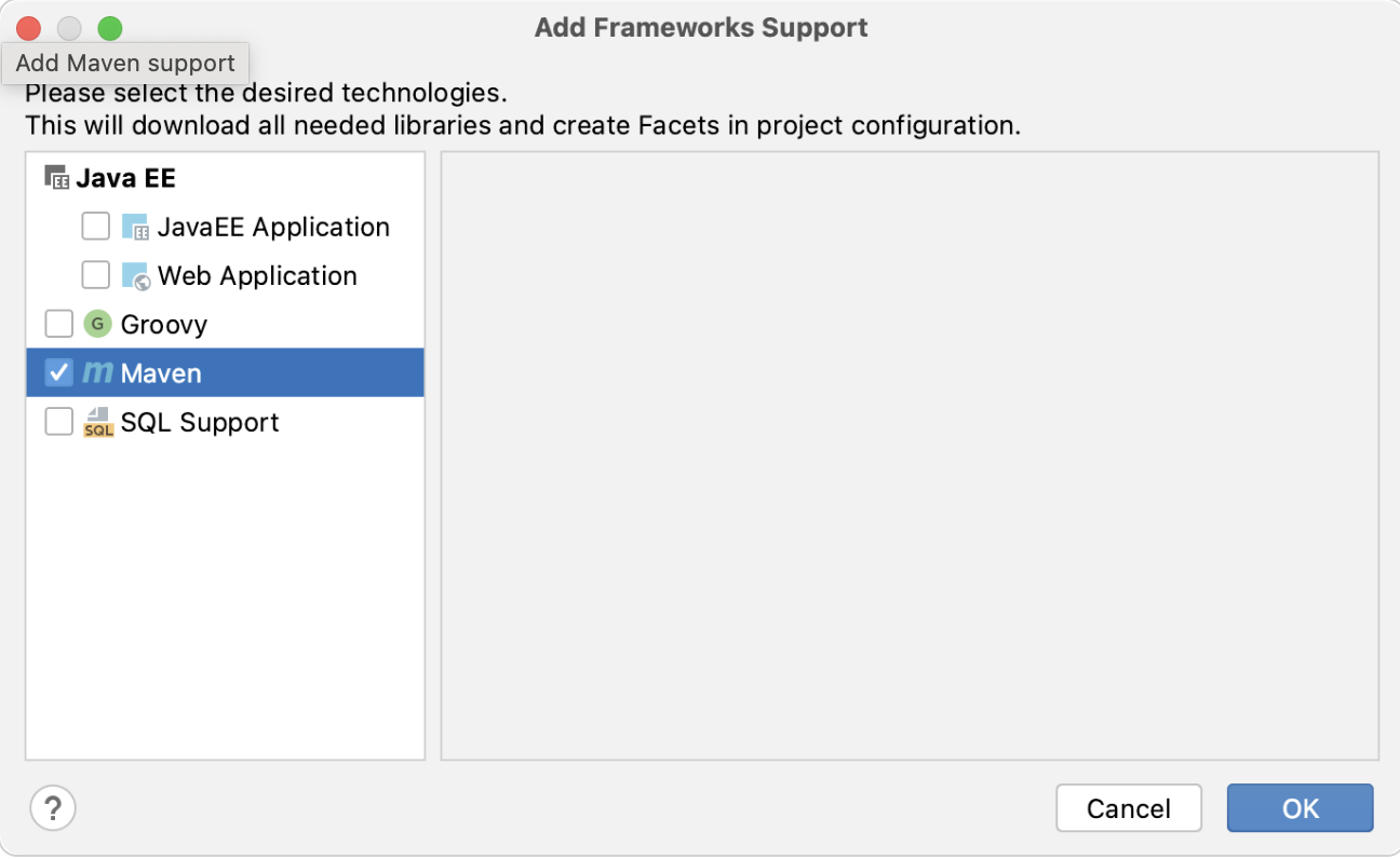 - 2. Сmd + Shift A (mac기준)를 누르고 add framework support를 검색하면 아래 사진과같이 나오는 것을 볼 수 있습니다.