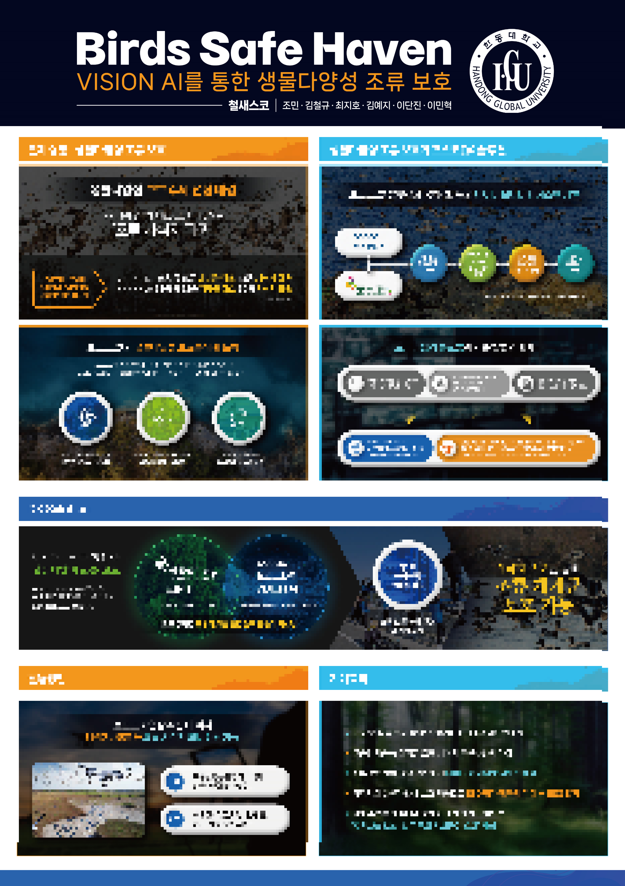 저희 팀은 먼저 어떠한 생물다양성 문제들이 있는지 알아봤습니다. 문제가 있다면 현재 대처 방안이 있는지 있다면 어떻게 하는지, 현재 방안에 부족한 점은 없는지 등에 대해서 구체적으로 조사했습니다. 생물다양성 문제 해결을 위한 여러 가지 문제들이 있었지만 저희는 철새 서식지 감소문제를 포스코 DX의 Vision Ai기술을 이용해 해결해 보기로 결정하고 기사, 논문, 유튜브 등 여러 자료를 찾기 위해 힘썼습니다. 생물, 조류와 전혀 관련이 없는 학부생들끼리 조사하다 보니 구체적인 정보를 얻기 어렵다고 판단이 되었습니다. 따라서 저희는 조류 전문가 분들께 자문을 구해보는 것이 좋다고 생각하여 조류 박사, 연구원, 유튜버 등등 관심이 있는 모두에게 메일을 보내어 조언을 구했습니다. 그러다 운이 정말 좋게도 국립생태원에서 조류를 연구하고 계시는 분과 컨텍이 되었습니다. 이분께서는 정말 감사하게도 약 4~5번의 줌 회의를 해주시며 저희 팀의 아이디어를 보완 및 발전시켜 주셨습니다. 이 과정에서 현재 멸종위기종 조류 개체를 분석할 때 사람이 일일이 개체수를 파악하기 때문에 인력과 시간이 낭비된다는 점을 새롭게 알게 되었고, 또한 이를 개선하기 위해 국립생태원에서의 2022년도 연구를 보며 드론으로 철새 서식지를 촬영해 촬영 이미지를 가지고 개체수를 파악한다는 점도 알게 되었습니다. 여기서 마침 POSCO DX의 Vision Ai기술을 활용한다면 드론 이미지 데이터를 가공하고 AI를 학습시켜 사람이 직접 셀 필요 없이 개체수, 행동 등을 파악할 수 있다는 점을 알게 되었습니다. 또 해외에선 비슷한 사례로 선행 연구가 진행된 논문도 읽으며 이 아이디어가 실제로 실현 가능하겠다는 가능성도 파악했습니다.