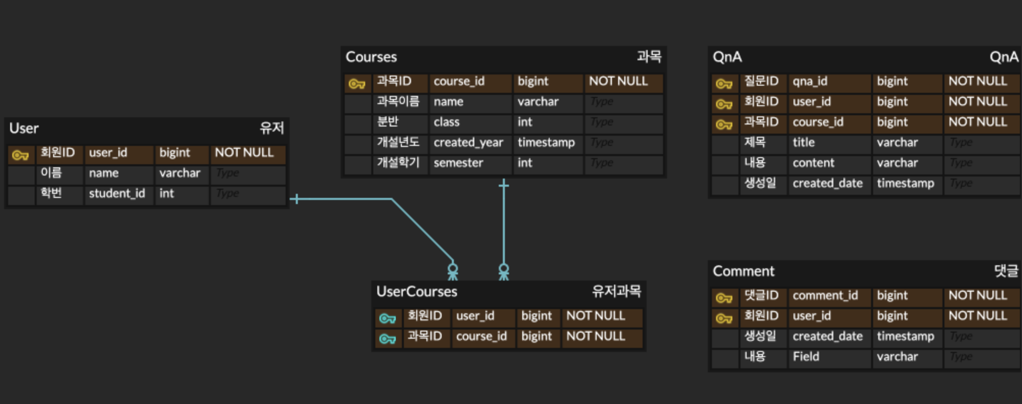 User와 Courses사이에 있는것은 UserCourse라는 것인데, 이는 JPA에서 자동으로 생성되긴 하지만 직접 만들어주는 것 나중에 테이블을 수정하는 데에 도움이 된다고 했다. UserCourse는 user_id와 course_id를 가지고 있는데, User에서 일대다 연결 또 courses에서 일대다 연결을 하여 중간 처리 역할을 해준다. (한 유저가 여러 개의 과목을 수강할 수 있고, 한 과목에 여러 명의 학생이 있을 수 있기 때문에)