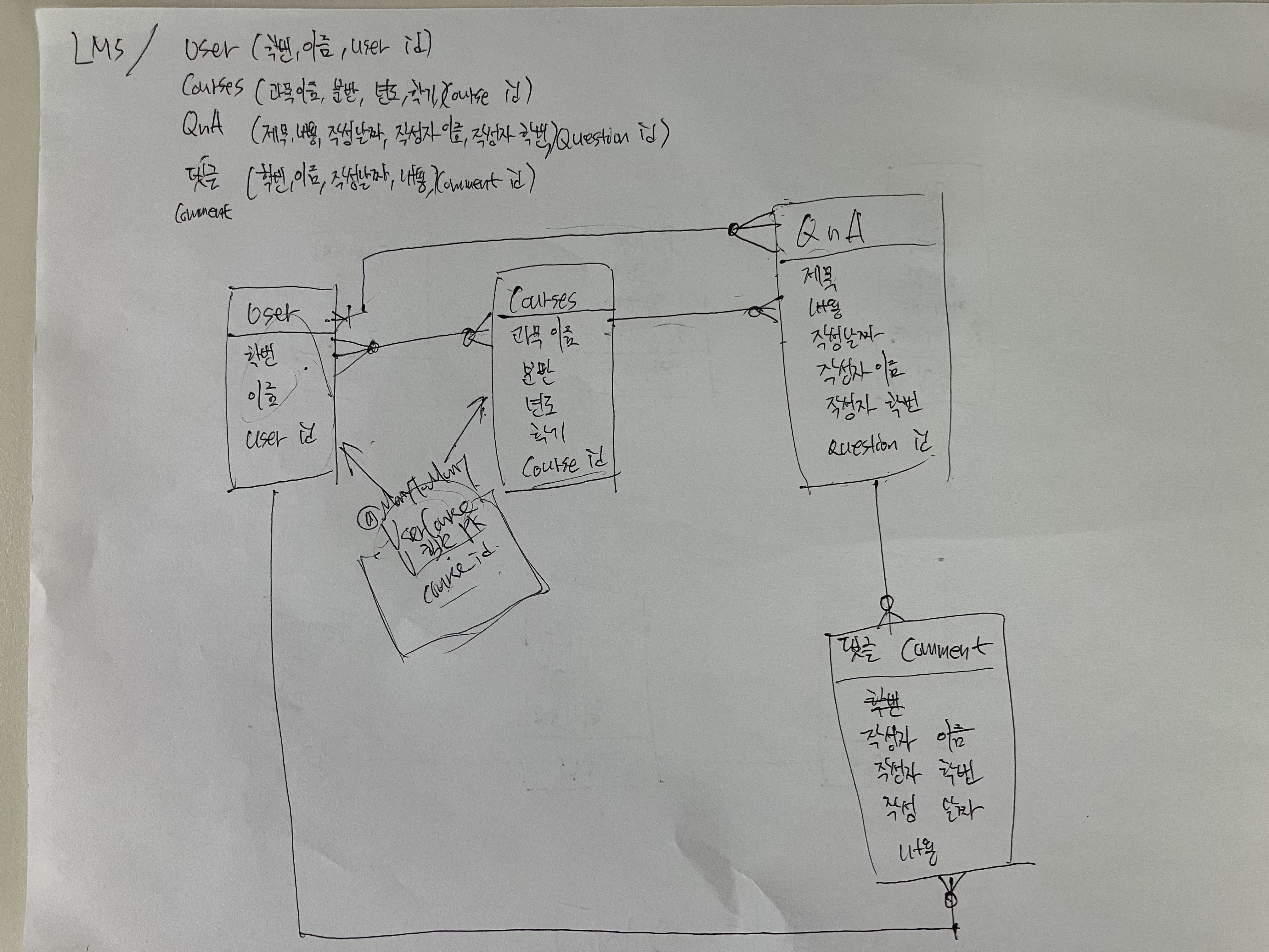 막상 하려니 머리속으로 생각했던 테이블을 어떻게 나누고 어떤 데이터들이 필요하고 어느 데이터 간의 관계가 있는지 정확히 모르고 있었다는 것을 깨달았다. 그래서 일단 종이에 막 적기 시작했다. 하다가 중간에 랩실 형한테 헷갈리는 개념과 ERD 설계 방법에 대해서 좀 물어보고 도움을 많이 받았다.