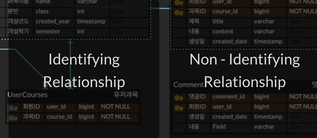 테이블들을 다 그리고 관계를 선으로 이으려고 하는데 Identifying Relationship과 Non - Identifying Relationship의 차이에 대해서 아직 잘 이해하지 못하여서 알아보는 중에 있다.
