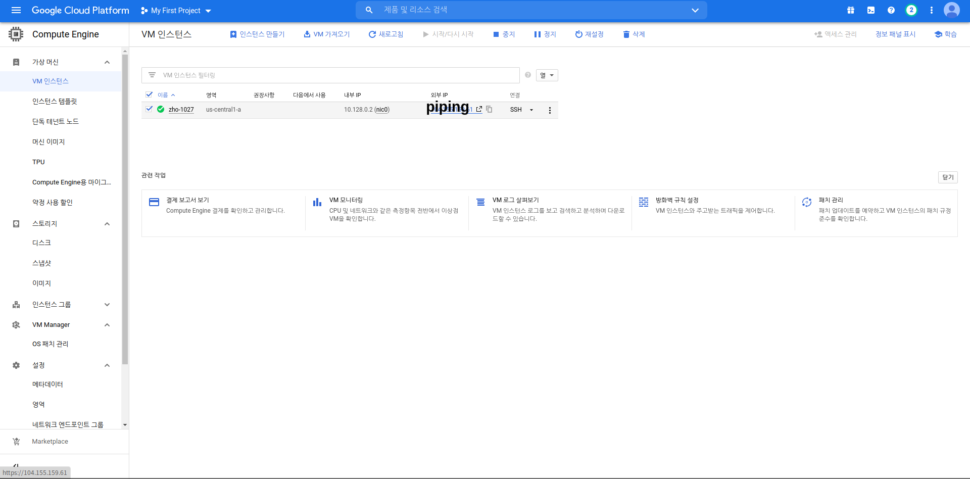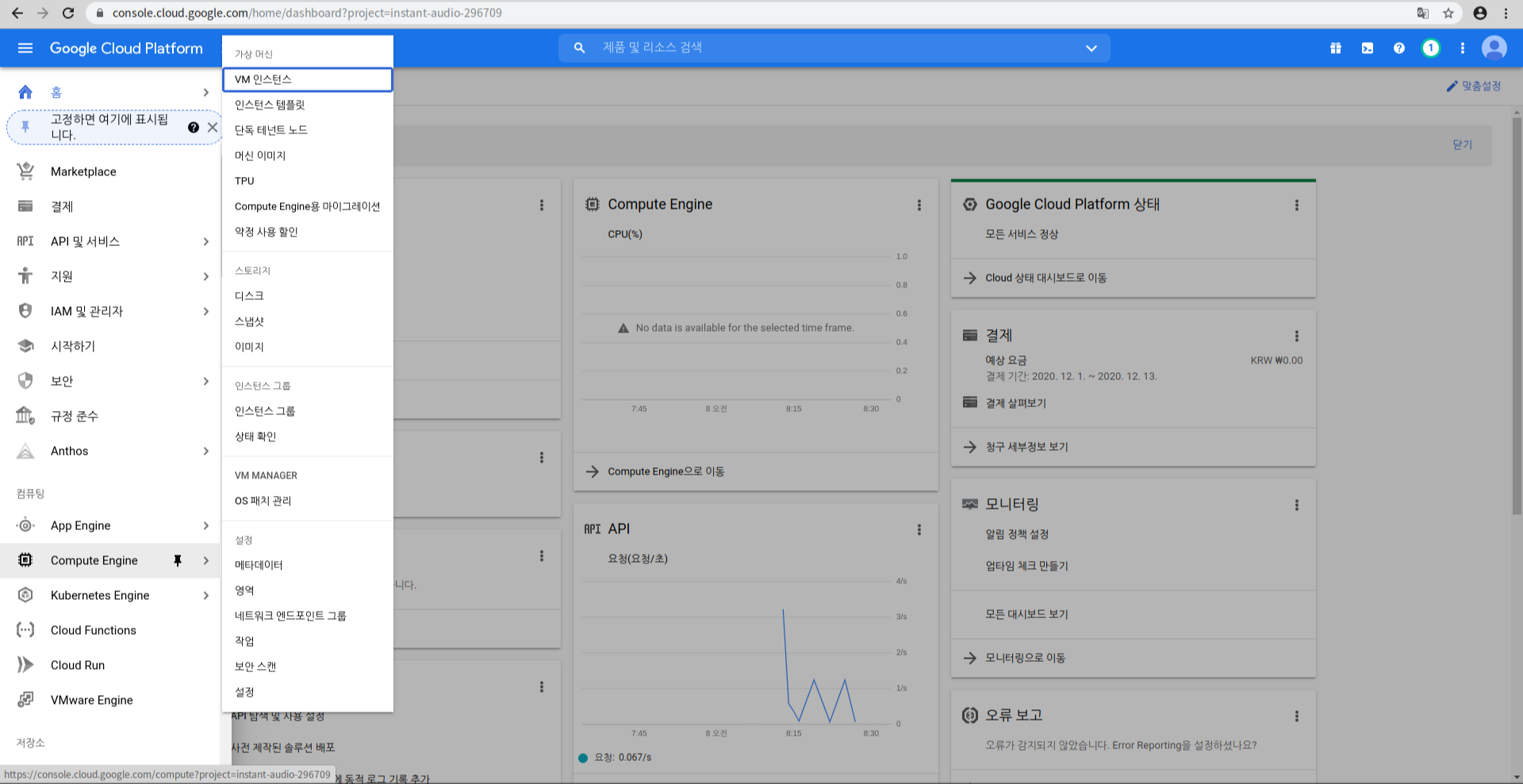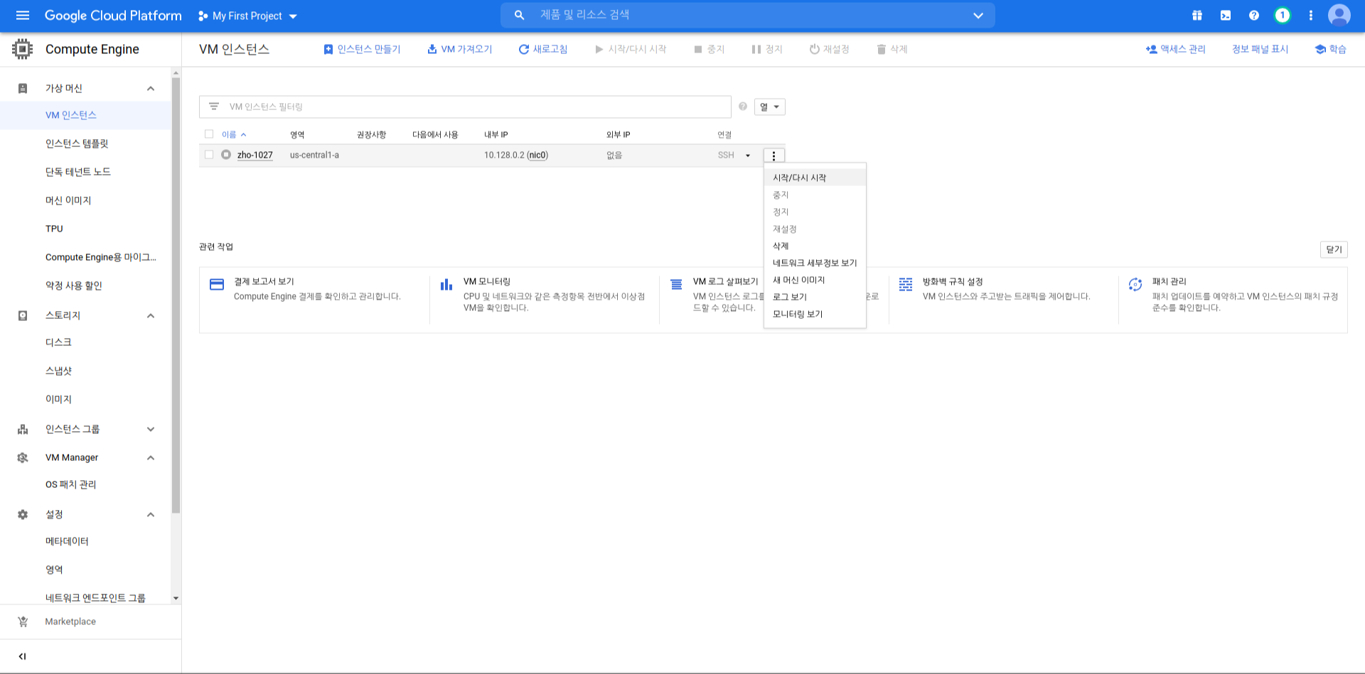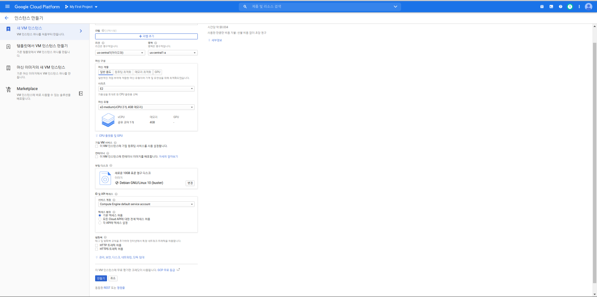 대시보드에서 Computer Engine - VM 인스턴스에 들어간다. 들어간 후 만들기 버튼을 클릭하게 되면,