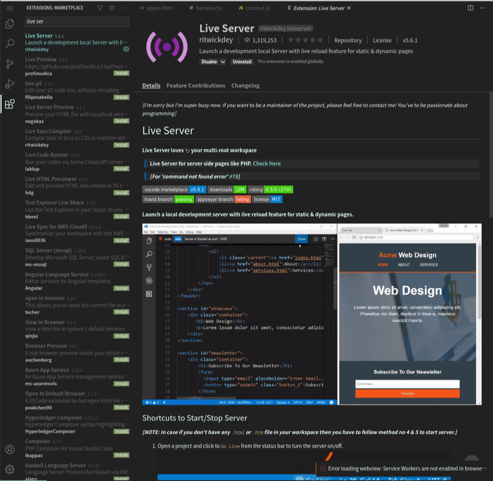 8. Live Server - html이나 css 수정 시 브라우저창에 새 로고 침하는 것을 없애줌. - 커맨드 팔레트에 > live Server: Open with Live Server 입력하고 short cut키 후 실행(but 원격으로 접속하는 경우 port forwarding을 통해 설정해야 함)