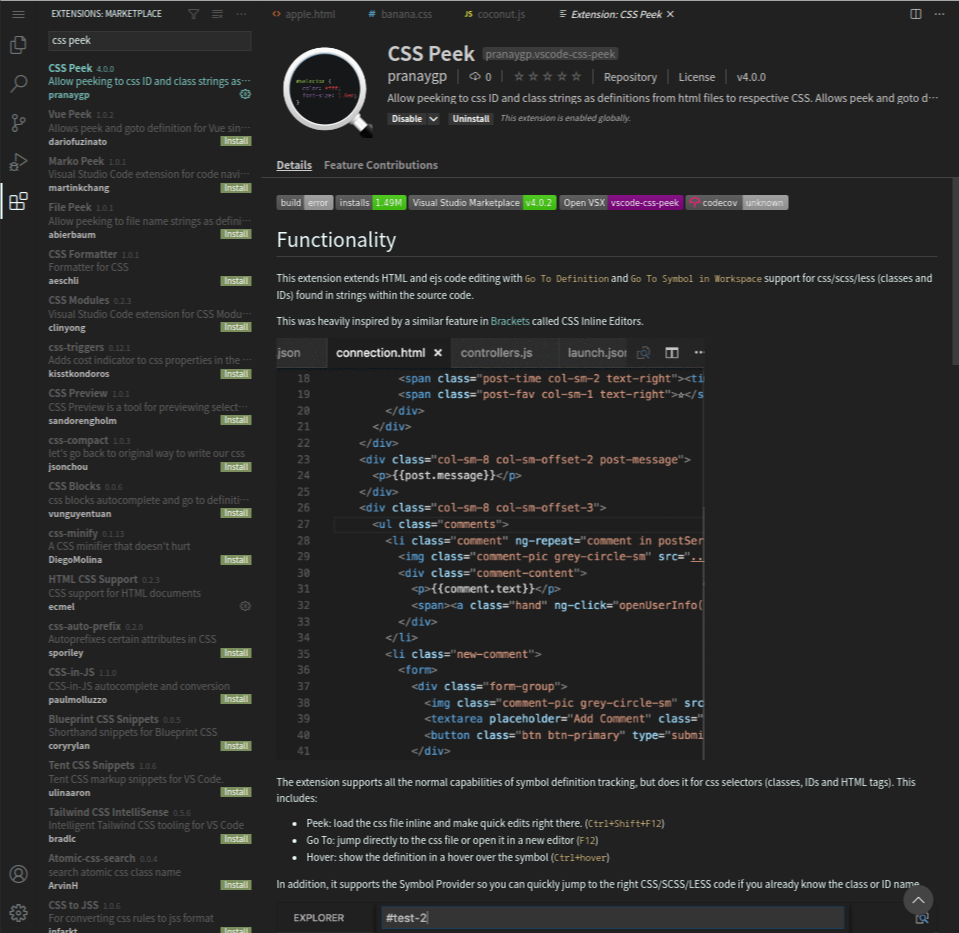 6. CSS Peek - html에서 css를 금방 찾게 해 줌 - html에서 커맨드나 컨트롤키를 누른 상태로 클릭하면 정의된 css파일로 이동하게 해 줌.