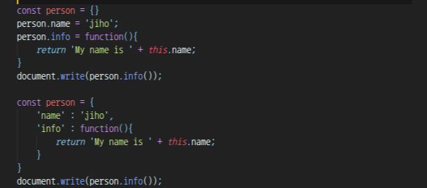 위 코드는 자바스크립트에서 객체를 만드는 2가지 방법이다.