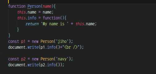 이때 만약 다른사람을 추가하게 된다면 객체의 정의가 중복될 것이다. ex) jiho, navy가 있으면