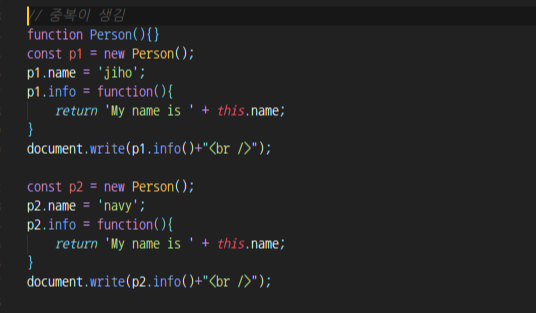 함수를 호출할 때 new 를 붙이면 새로운 객체를 만든 후 리턴한다. 위 코드를 설명하자면 새로운 객체를 p1, p2에 담았다고 보면 된다. 하지만 생성자를 이용해도 여전히 info = function(){ return 'My name is' + this.name;} 은 중복이 된다...