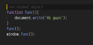 위 코드에서 func(); 그리고 window.func(); 둘 다 동일하게 실행이 된다. 이로 알 수있는 사실은 모든 전역변수와 함수는 window(전역객체)객체의 프로퍼티이다.