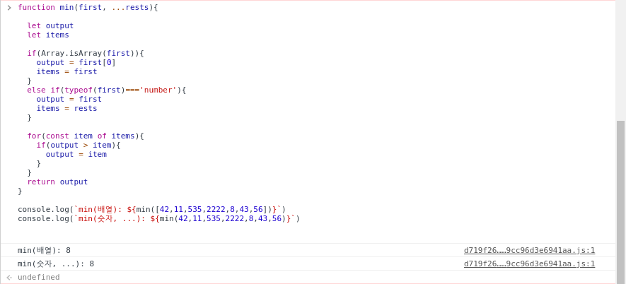 -min(배열), min(숫자, 숫자,...) 형태로 베개 변수를 넣으면 최솟값을 찾아주는 함수를 만들어보자.