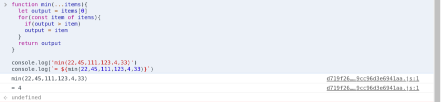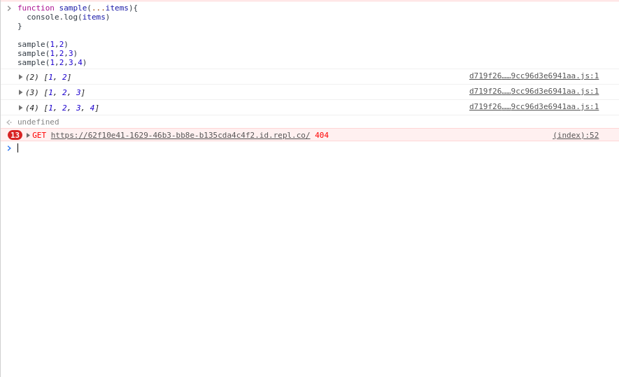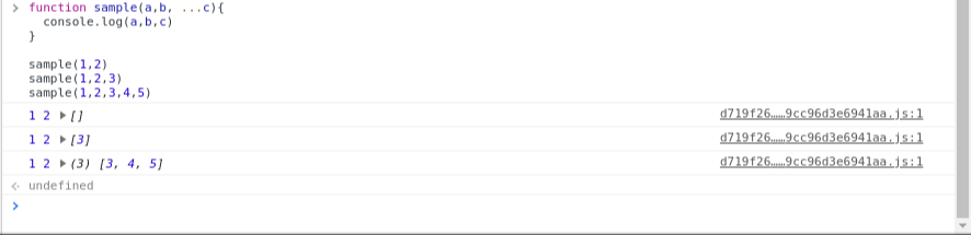 위 사진에 나오는 결과에서 볼 수 있듯이, sample(1,2) , sample(1,2,3) 그리고 sample(1,2,3,4)로 호출했던 매개변수가 배열의 형태로 들어온다는 걸 확인할 수 있다.