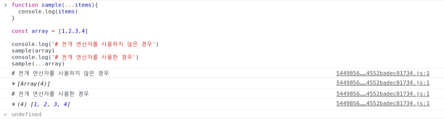 전개 연산자를 사용하지 않은 경우엔 배열이 매개변수로 들어오고, 전개 연산자를 사용한 경우엔 숫자가 하나하나 전개되어 매개변수로 들어오는 걸 확인할 수 있다.