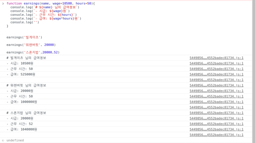 매개변수로 시급과 시간을 입력받아 급여를 계산하는 함수를 만들어보자.