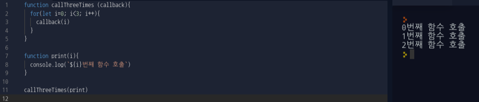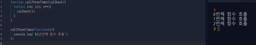 3.callThreeTimes() 함수 내부에선 callback(i) 형태로 함수를 호출함.