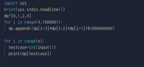 각 테스트 케이스마다, n을 1, 2, 3의 합으로 나타내는 방법의 수를 1,000,000,009로 나눈 나머지를 출력한다.