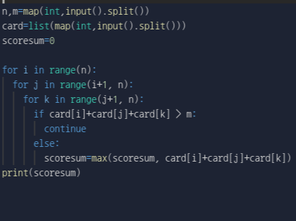 첫째 줄에 카드의 개수 N(3 ≤ N ≤ 100)과 M(10 ≤ M ≤ 300,000)이 주어진다. 둘째 줄에는 카드에 쓰여 있는 수가 주어지며, 이 값은 100,000을 넘지 않는 양의 정수이다. 합이 M을 넘지 않는 카드 3장