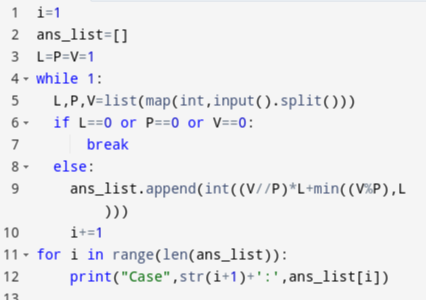 입력은 여러 개의 테스트 케이스로 이루어져 있다. 각 테스트 케이스는 한 줄로 이루어져 있고, L, P, V를 순서대로 포함하고 있다. 모든 입력 정수는 int범위이다. 마지막 줄에는 0이 3개 주어진다.