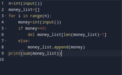 첫 번째 줄에 정수 K가 주어진다. (1 ≤ K ≤ 100,000) 이후 K개의 줄에 정수가 1개씩 주어진다. 정수는 0에서 1,000,000 사이의 값을 가지며, 정수가 "0" 일 경우에는 가장 최근에 쓴 수를 지우고, 아닐 경