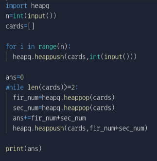 heapq 우선순위 큐 유형을 새롭게 알게 되었음.(heapq.heappush(card,int(input()), heapq.heappop(cards))